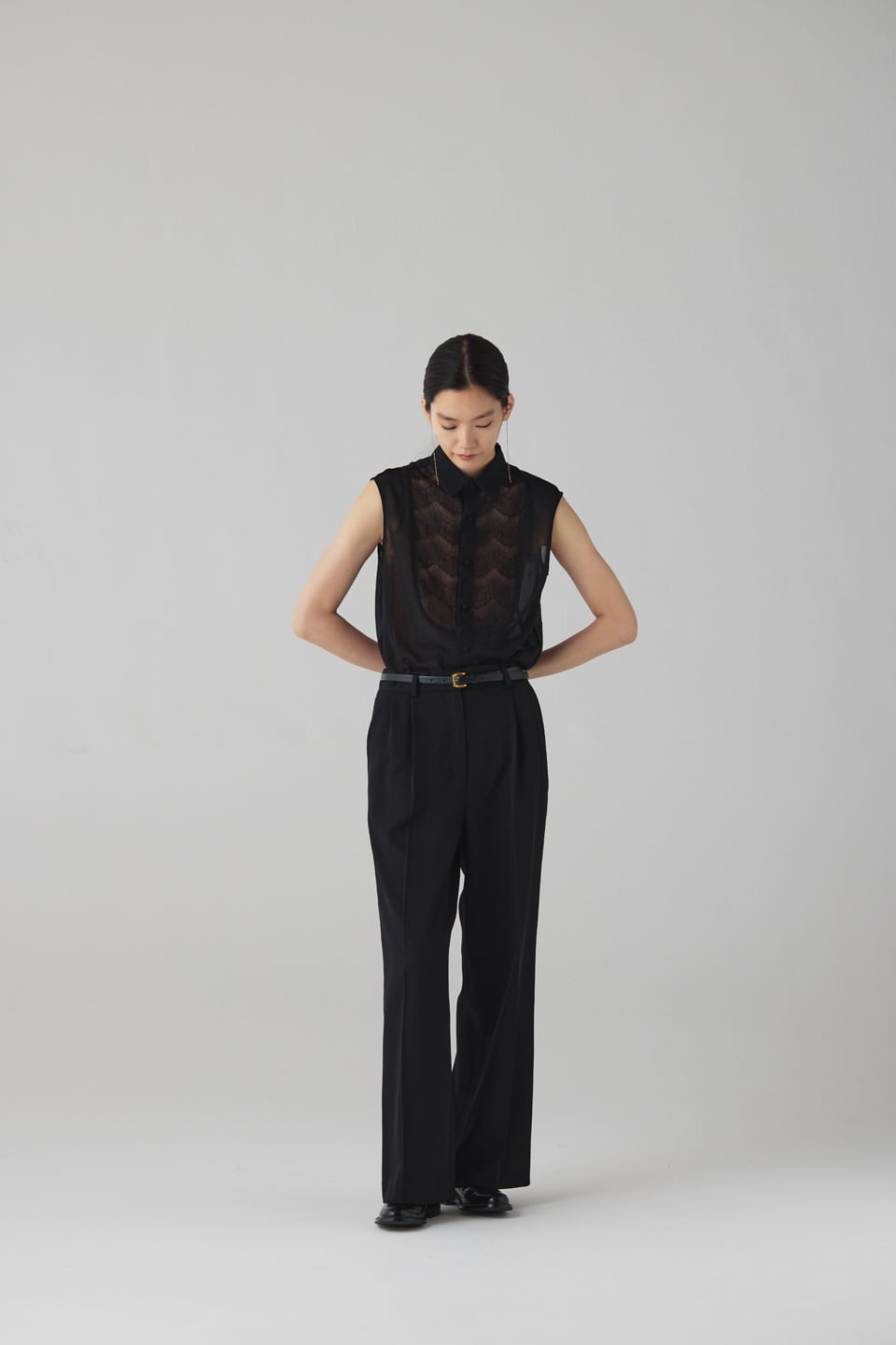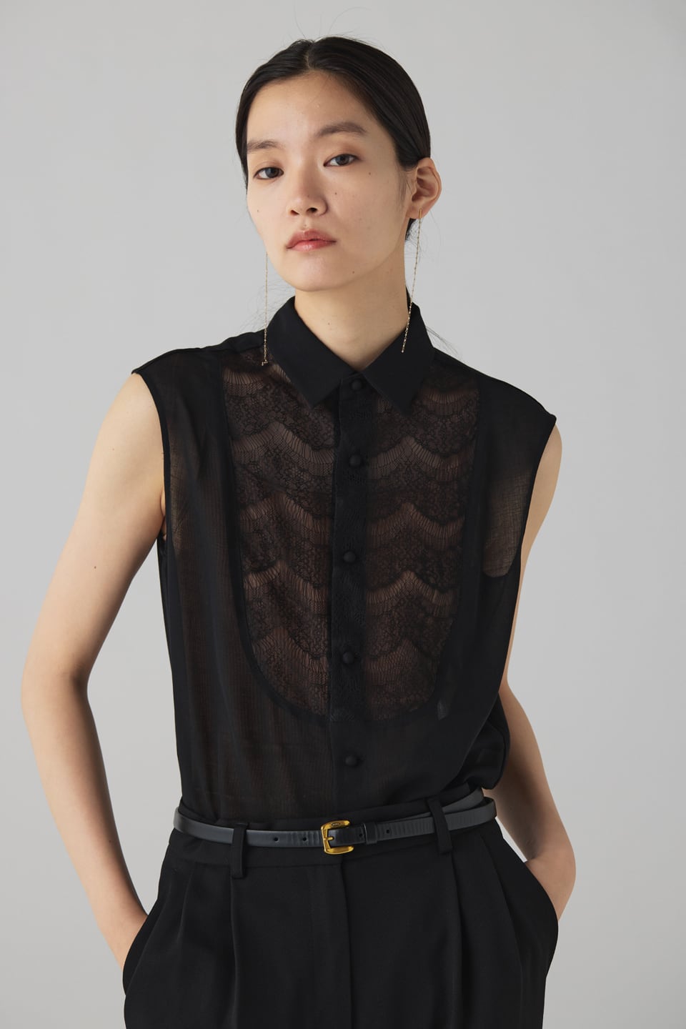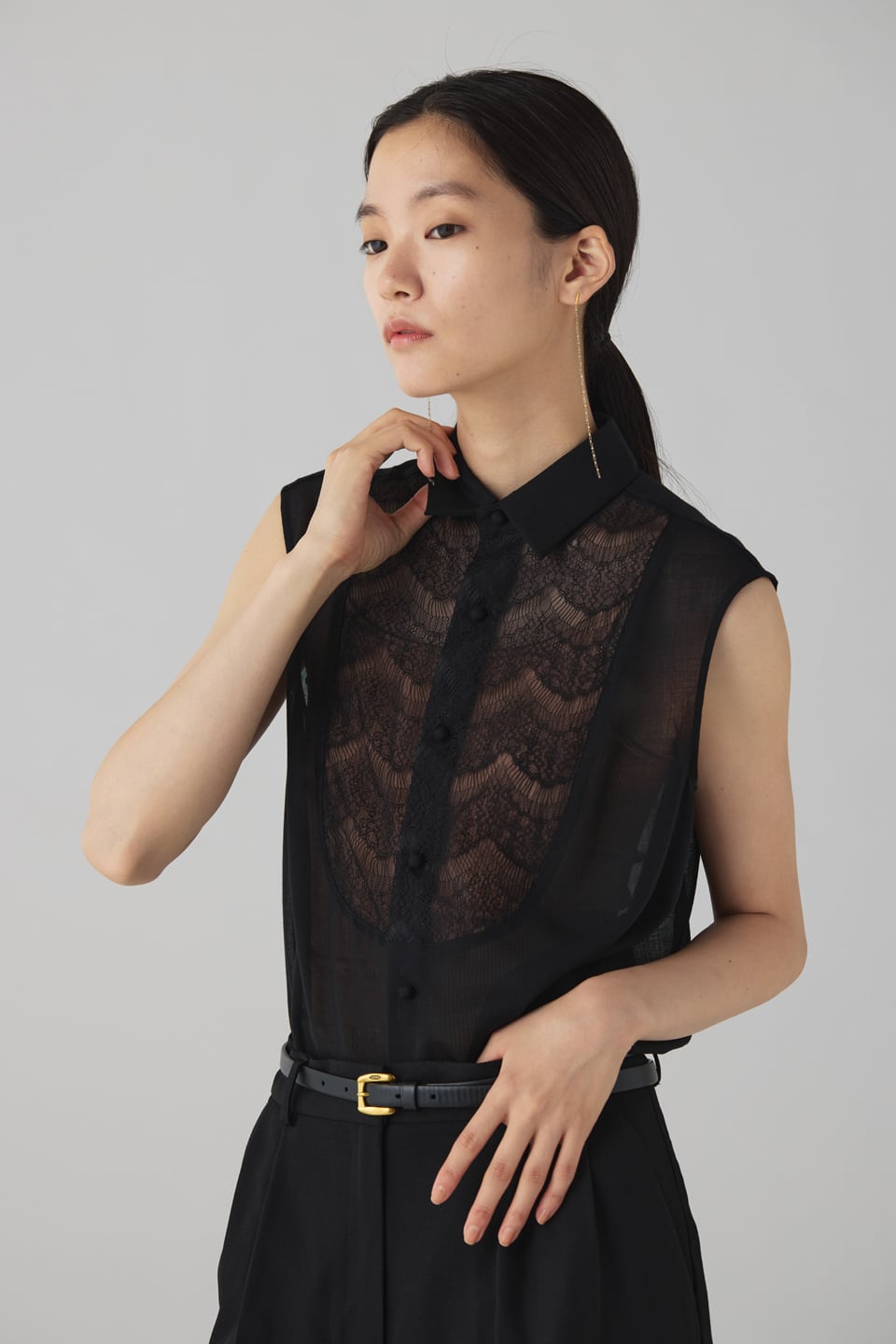 胸元をレースで切り替えたデザインが、印象的なブラウスです。繊細で美しいレースは、フランス・solstiss(ソルスティス)社のもの。6000~7000のボビンにひとつひとつ糸をセッティングするなど、熟練の技術者により手間と時間をかけて作られたレースは、ヨーロッパの高級レースの代名詞ともいわれており、英国のキャサリン妃のウェディングドレスなどでも使われました。今回、デザイナーがこのレースに一目惚れし、美しい模様が映えるデザインのブラウスを仕立てました。