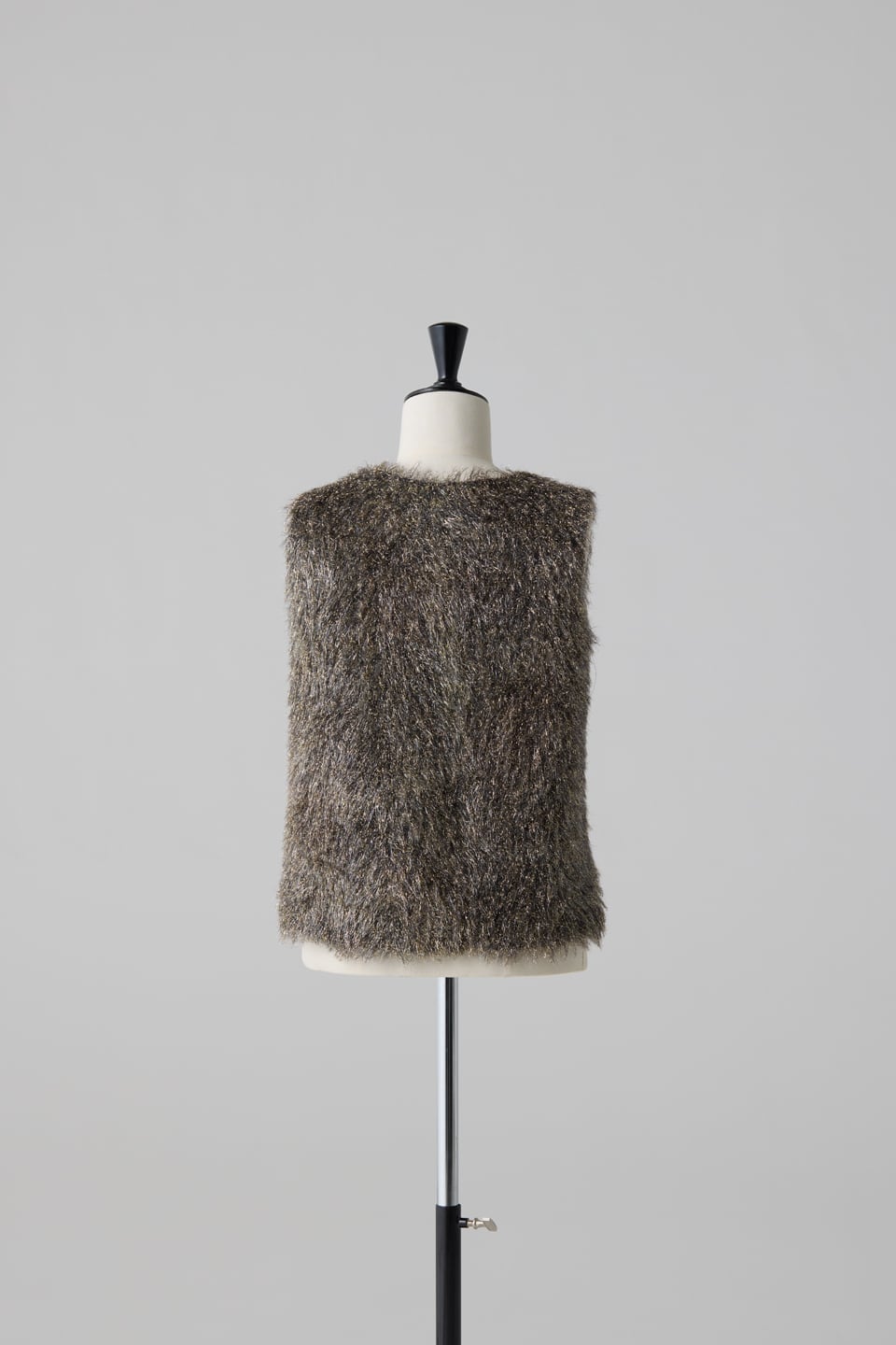 「今までのSAQUIにはない服を作りたい」という、デザイナーの思いから生まれたタンクトップは、キラキラと光るシャギー素材でインパクト大。ダークカラーやワンパターンにまとまりがちな秋冬コーデを引き立て、「いつものコーデ」に羽織るだけでおしゃれ上級者に。特別なアクセサリーのような1枚です。
