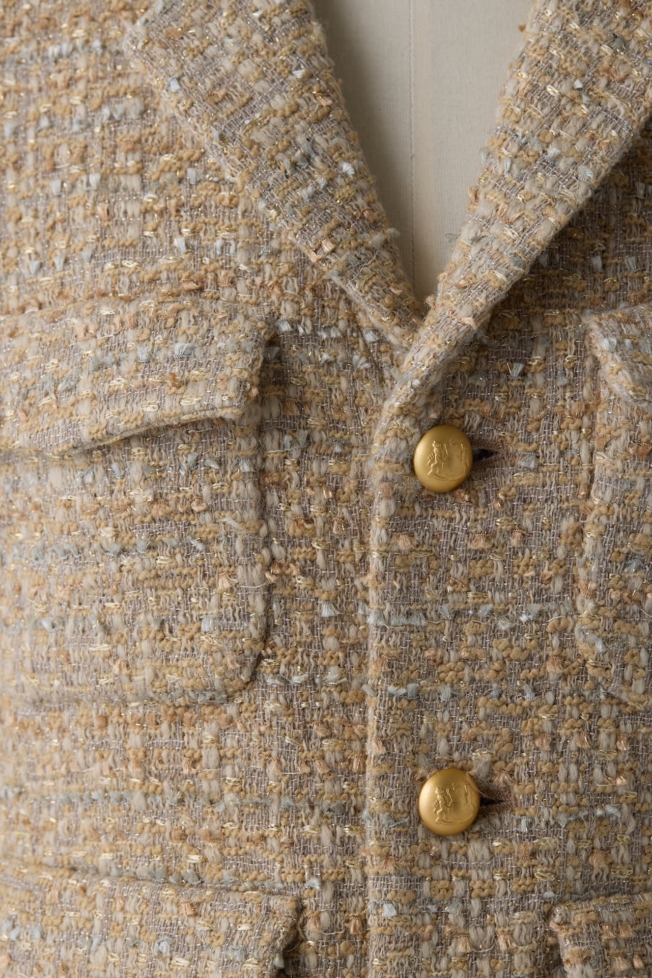 襟付きなのでとてもエレガント、よりフォーマルな場所で着ていただけます。ビックフラップを左右に2つずつ配置することで立体感を出し、上半身が寂しく見えないよう、それでいて身体の線が出ないよう、パターンを工夫しました。ジャケットの印象を決めるボタンもクラスアップを叶えるヴィンテージ調のゴールドメタルボタンで、遊び心を加えています。丈はパンツにもスカートにも合わせやすいよう短めにしました。