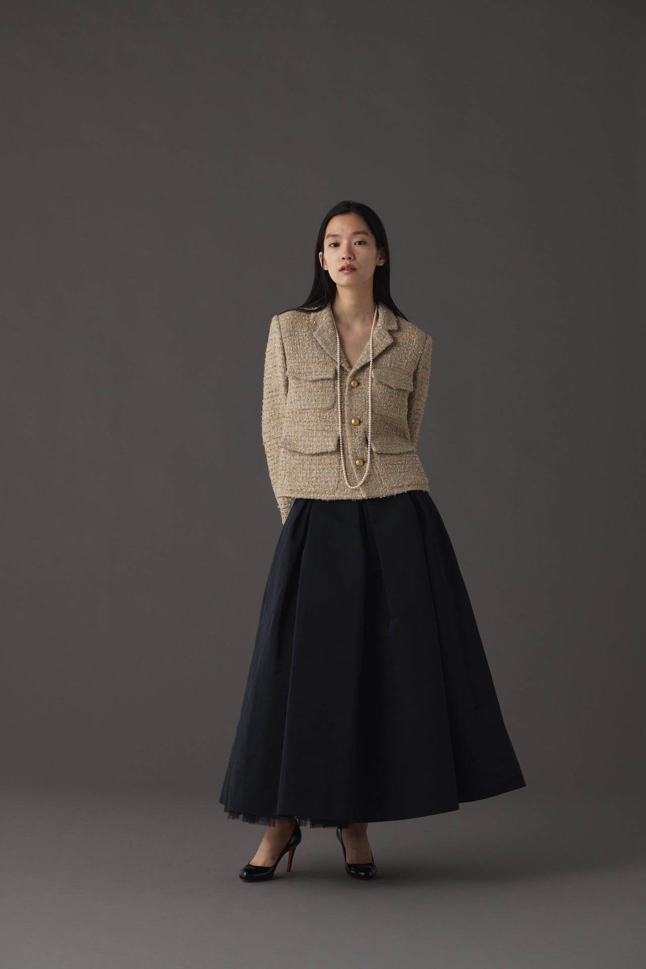 SAQUIが大切にしているのは、まず素材の上質さ。このツイードも、一見シックながらもよく見るとベージュやグレー、ゴールドなど色とりどりの柔らかいリボンや艶のある糸の束などが織り込まれた、ファンシーツイードとよばれる、とても凝った素材です。そのため、袖を通したときの美しさ、存在感が段違い。イタリアのツイードメーカーの最高峰・GIOLICA(ジオリカ)社のMACNIFICAというラインのもので、「パリコレクションにデビューするにあたり、思い切って採用した」という、ピンクツツィードと同じメーカーです。