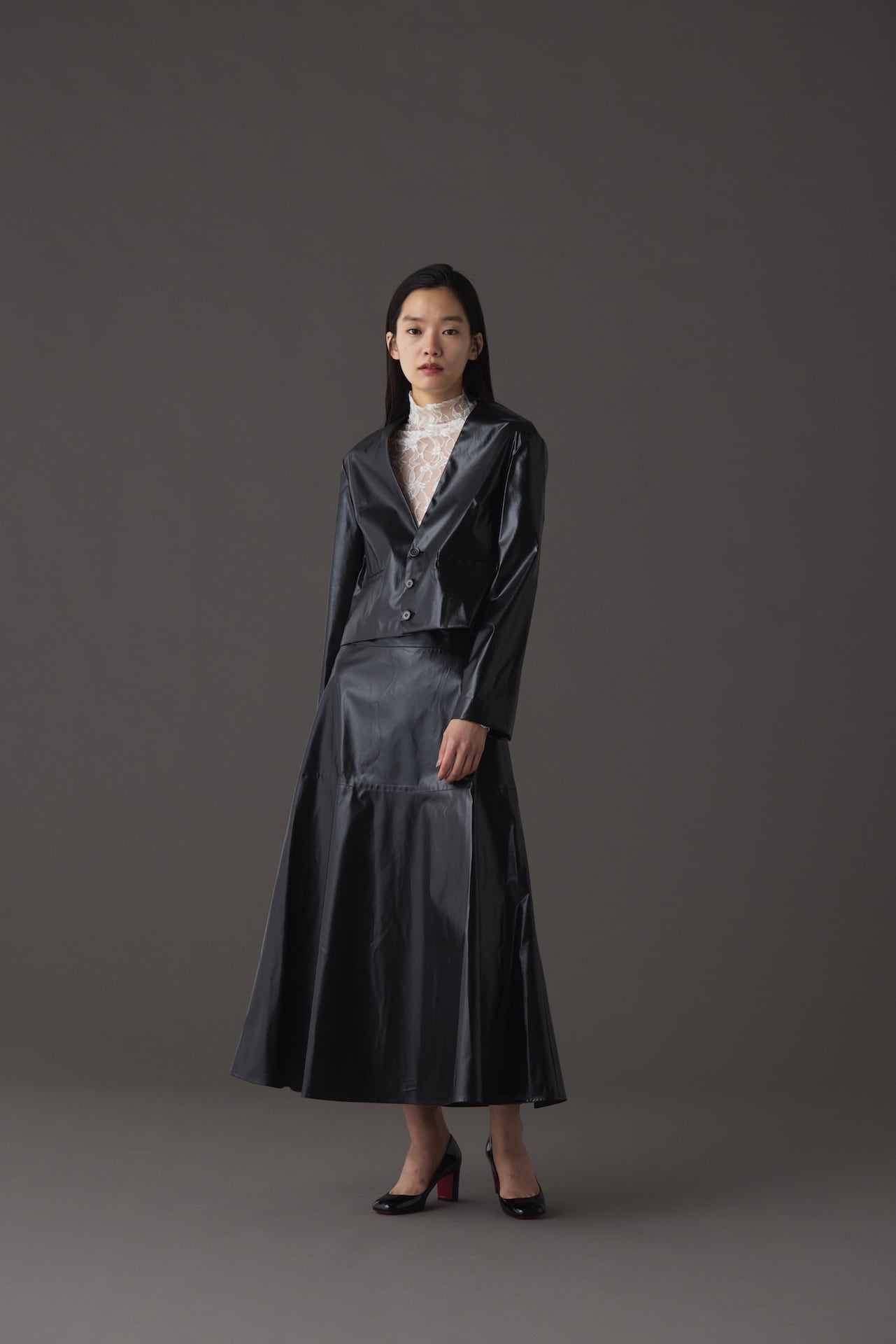 「パテント素材を着るのがはじめてという方は、スカートが取り入れやすいと思います」とデザイナー。ざっくりしたニットやTシャツなどを合わせたワンツーコーデでも、スカートの存在感でひと味違った着こなしに。レースの黒いストッキングやタイツとも相性抜群。もちろん、同素材のノーカラージャケットとのセット使いもおすすめです。