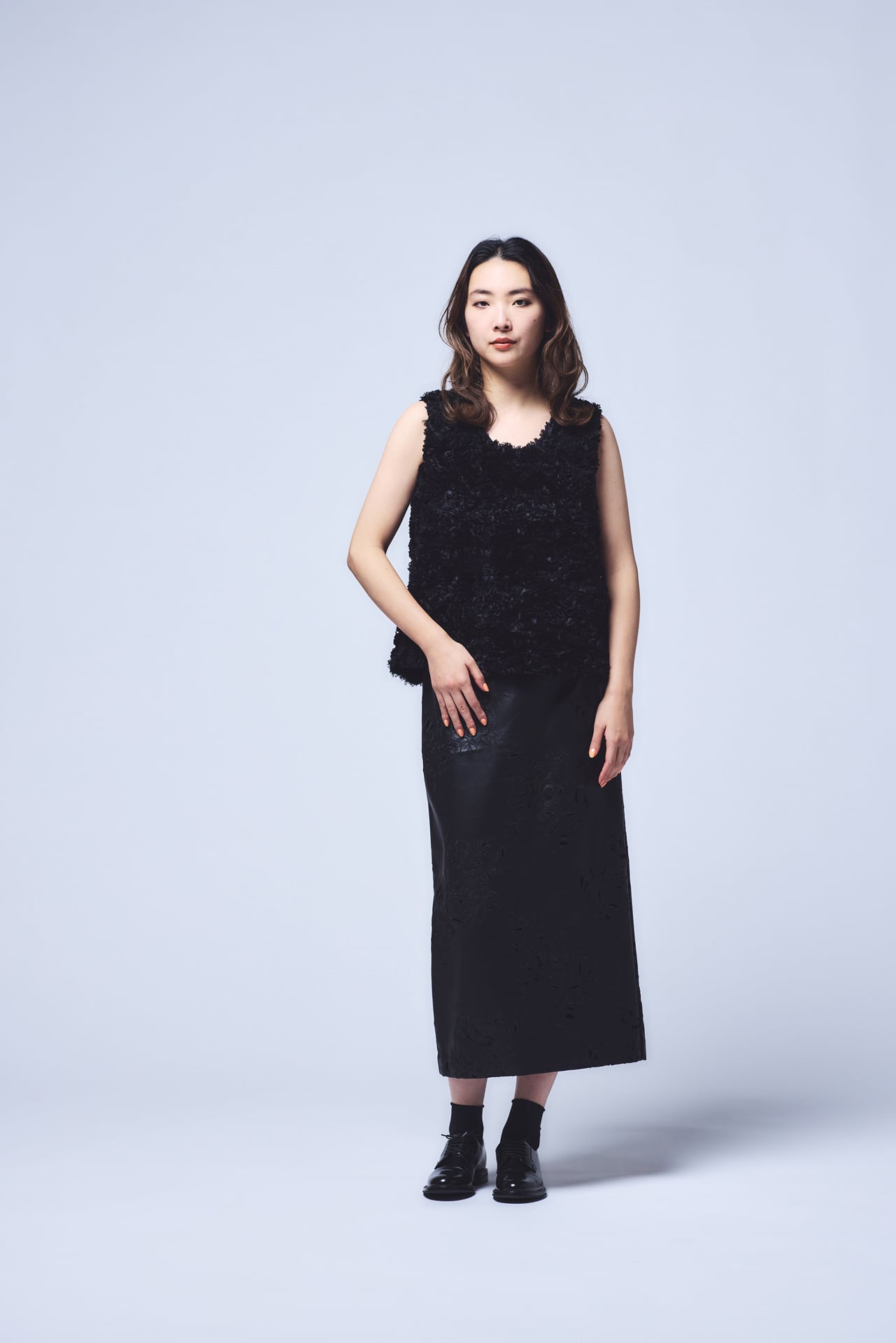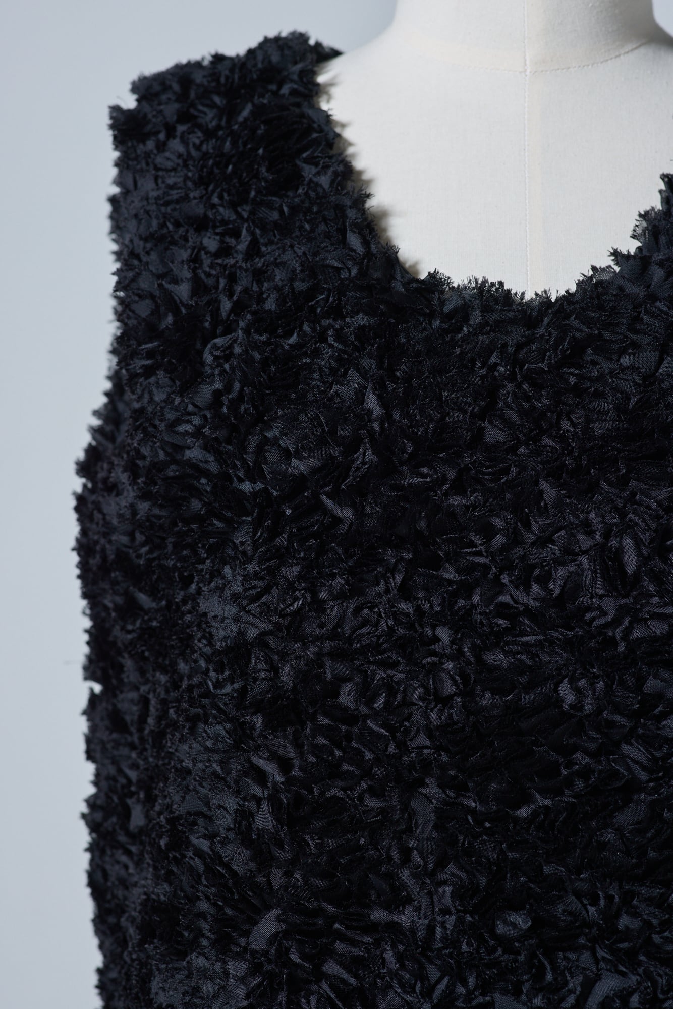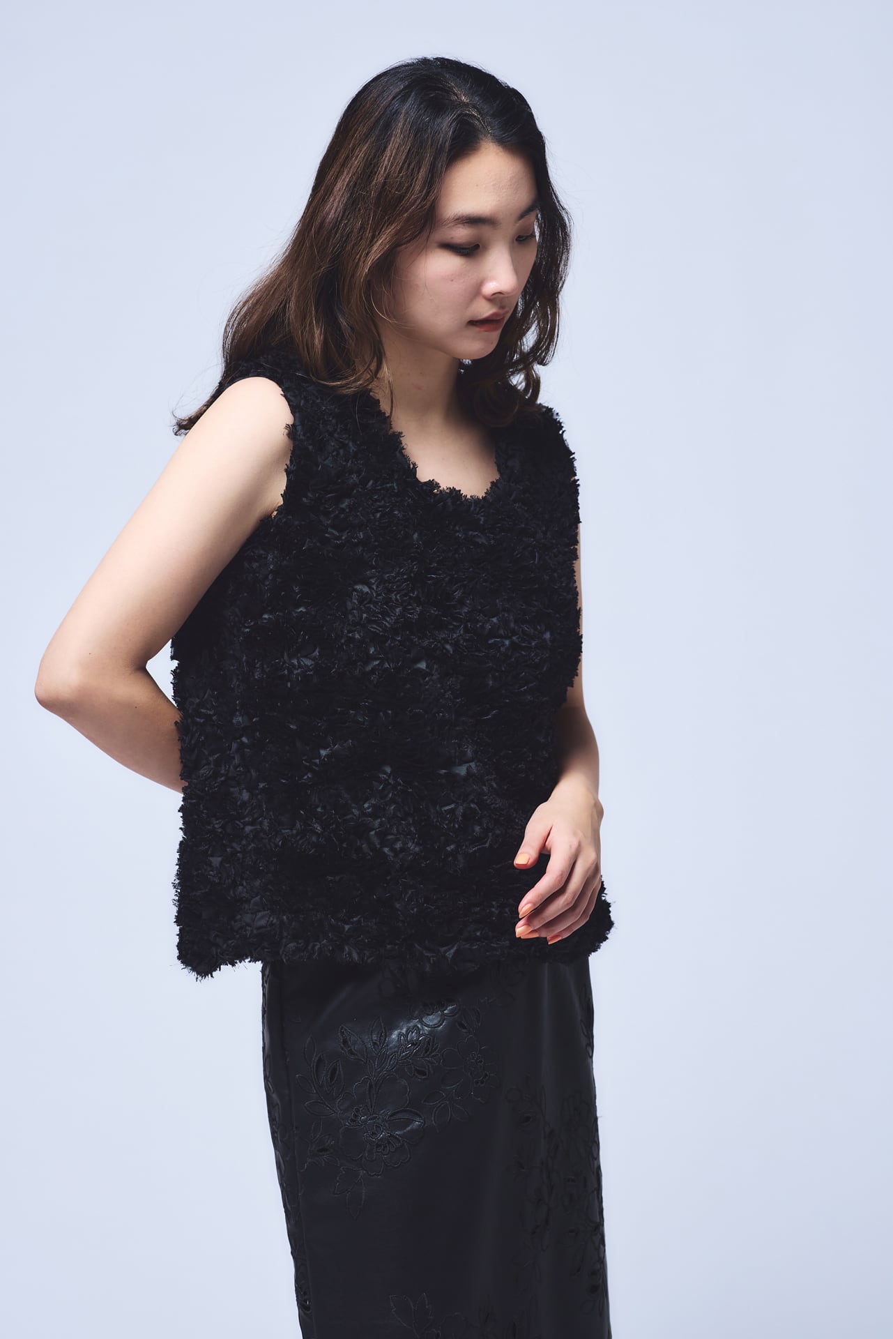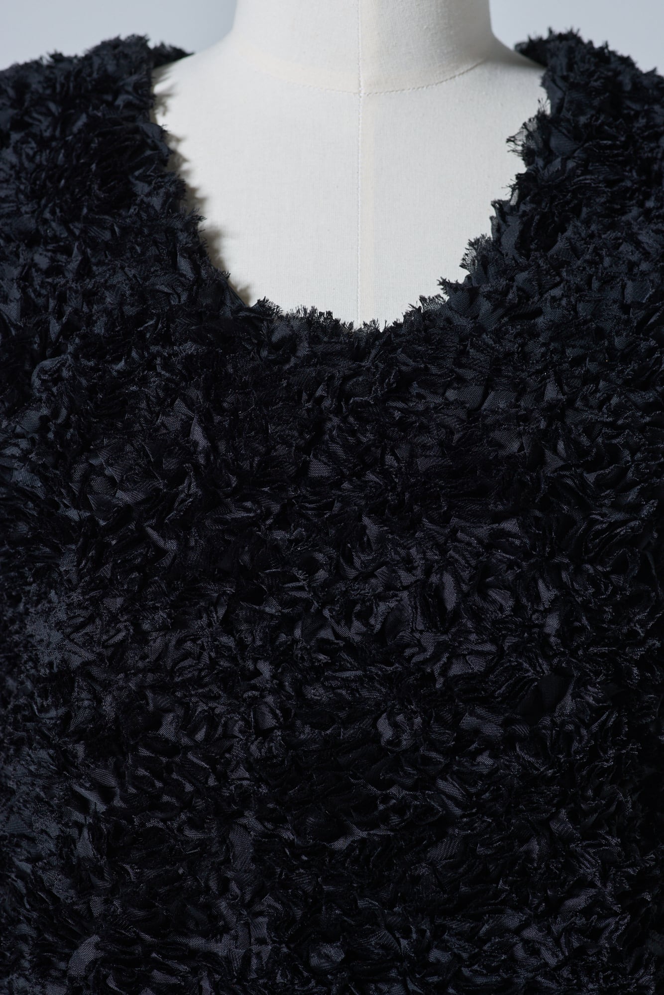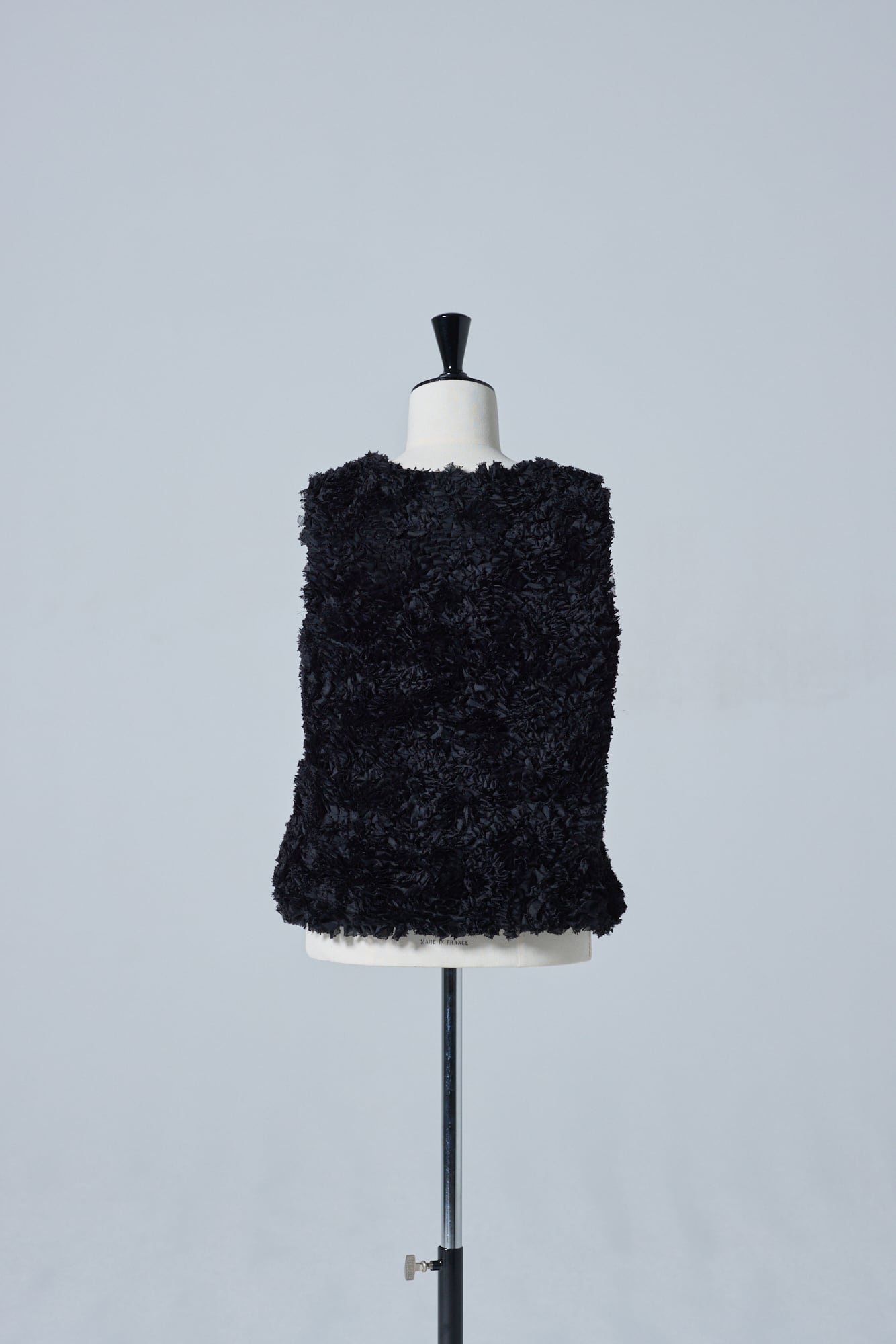 シフォンリボンがたっぷりとあしらわれたイタリア製生地を使用したプルオーバー。昨年の受注会で大人気のアイテムでした。ほんのり光沢感もあるのでボリュームのあるスカートやハイヒールなどと合わせれば華やかなおでかけに、デニムと合わせればカジュアルにも着こなせます。黒のレザーなどハードなものと合わせるのもおすすめ。黒なので派手になりすぎず、大人かわいい雰囲気に見せてくれます。生地のボリューム感のおかげで二の腕が気にならないのもうれしい。肌寒い日は、薄手のタートルやカットソーの上にレイヤードして楽しんでも。