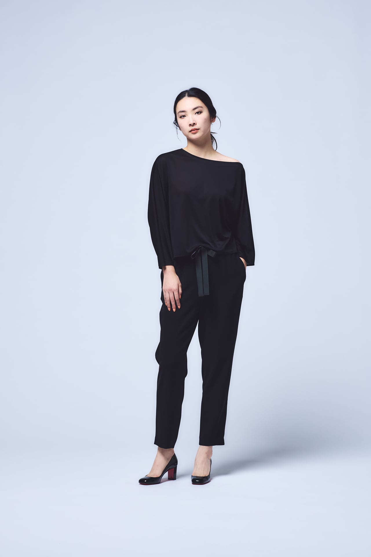 肩の部分をアシンメトリーに仕上げて遊び心を加えたプルオーバーです。いつものスカートやパンツ、デニムもこの一枚を合わせるだけで、カジュアルコーディネートがちょっとシックに、ワンランク上に仕上がります。さらっと軽く、落ち感がきれいなうえ、ドルマンスリーブなので動きやすさも抜群。おうちで洗えるので、ついつい手が伸びる一枚になりそうです。