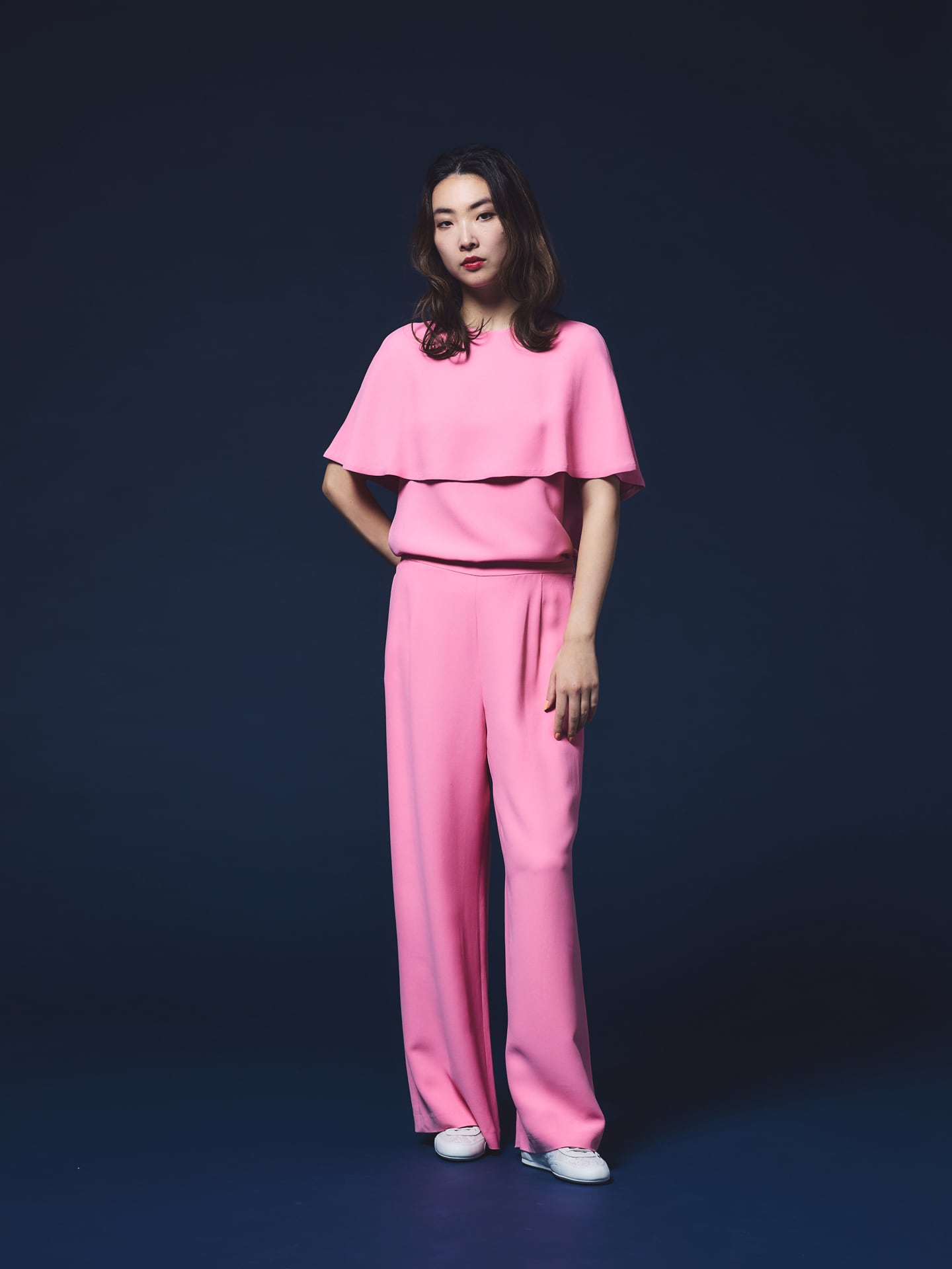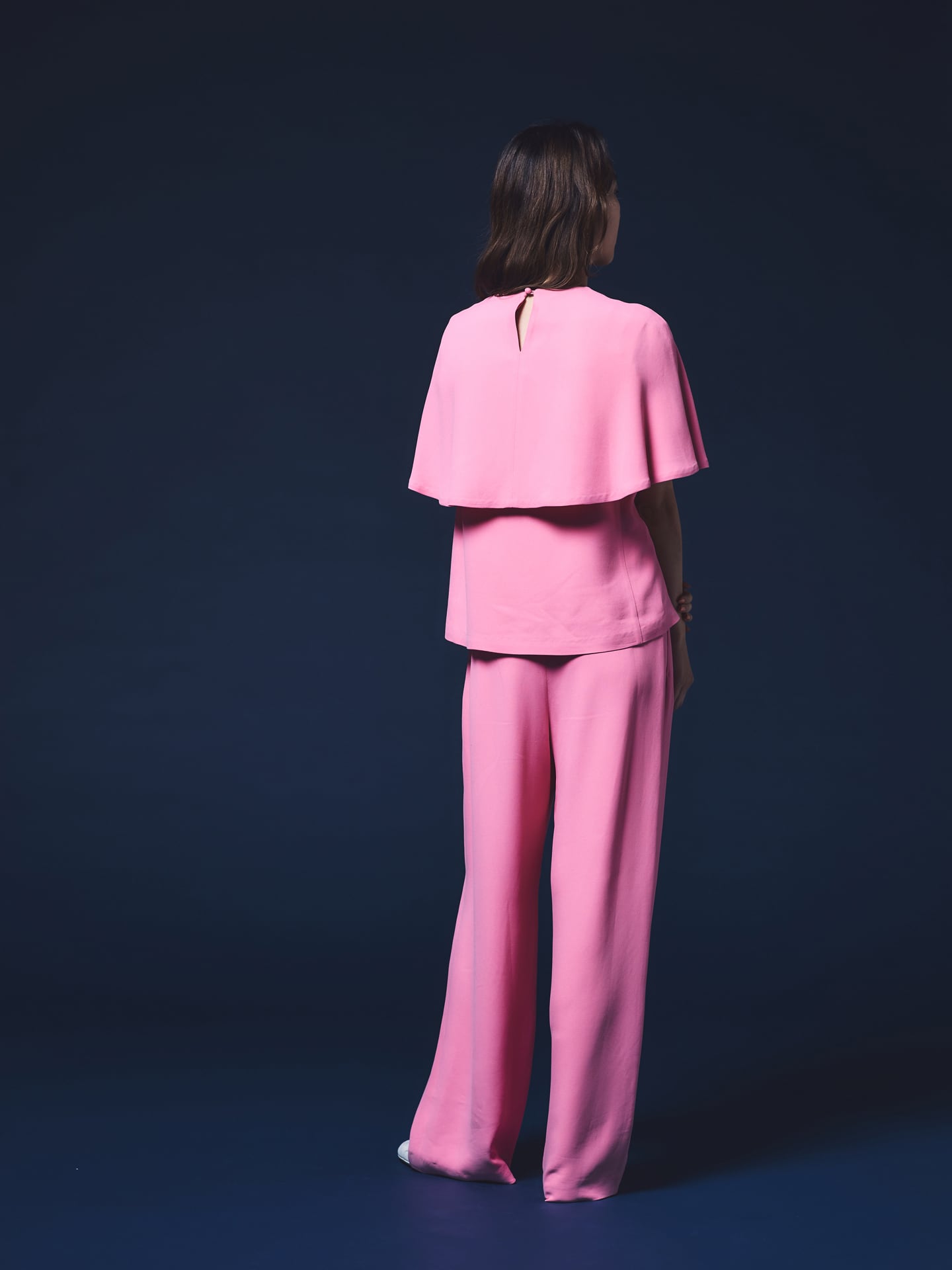 ピンクケープブラウスとのセットアップは、入学式などのオケージョンシーンにも。ブラウスは肘が見えない長めのケープ丈なので、ジャケットを着ずともフォーマル感があるため、食事会などだけではなく、結婚式などの華やかなパーティシーンにもおすすめです。