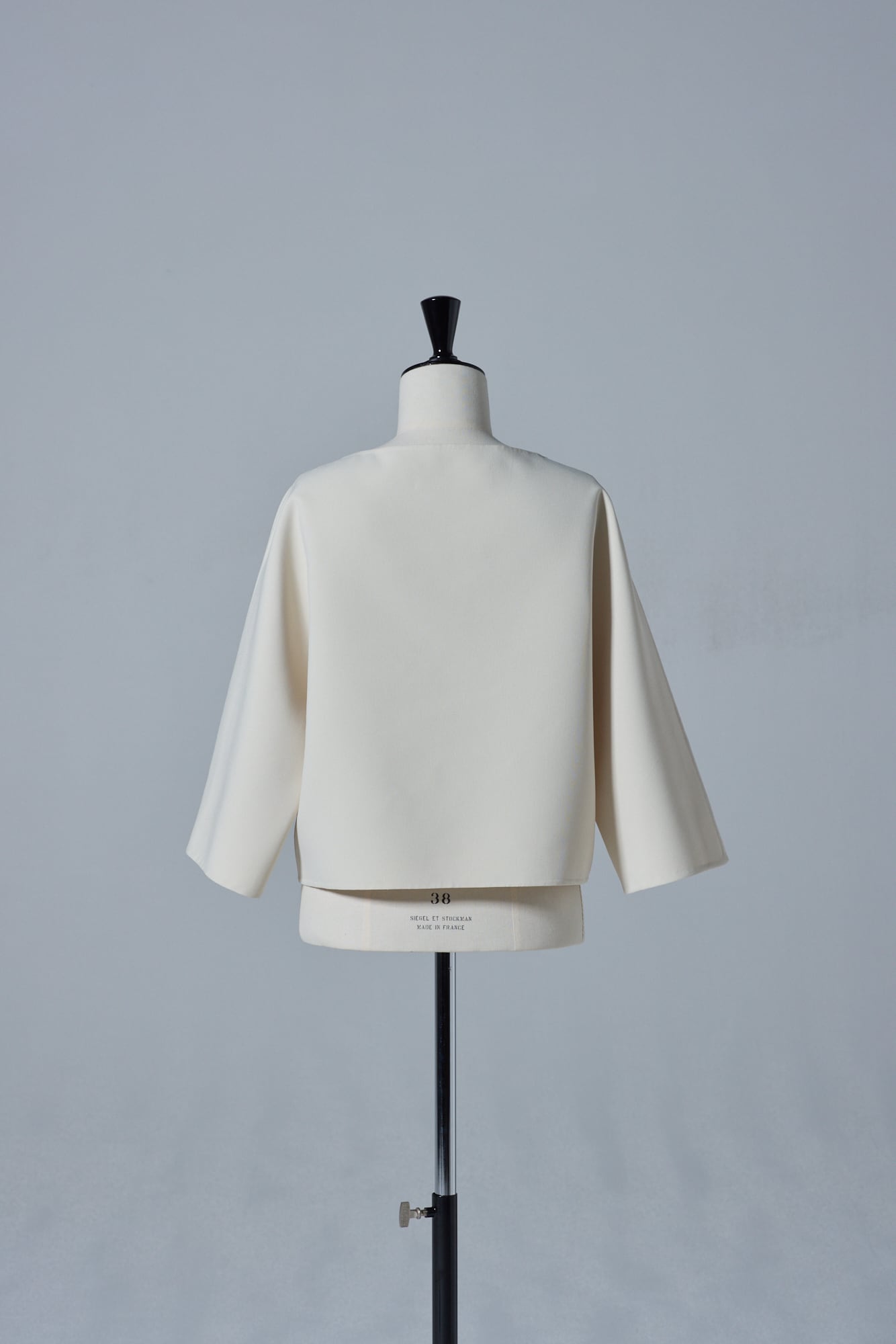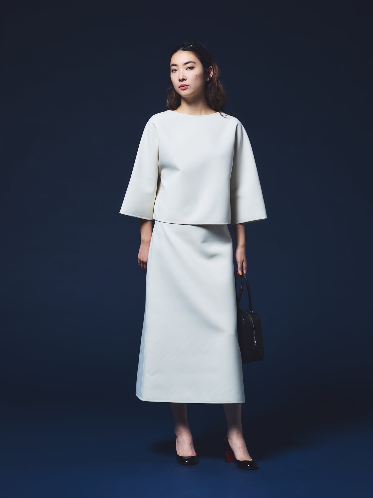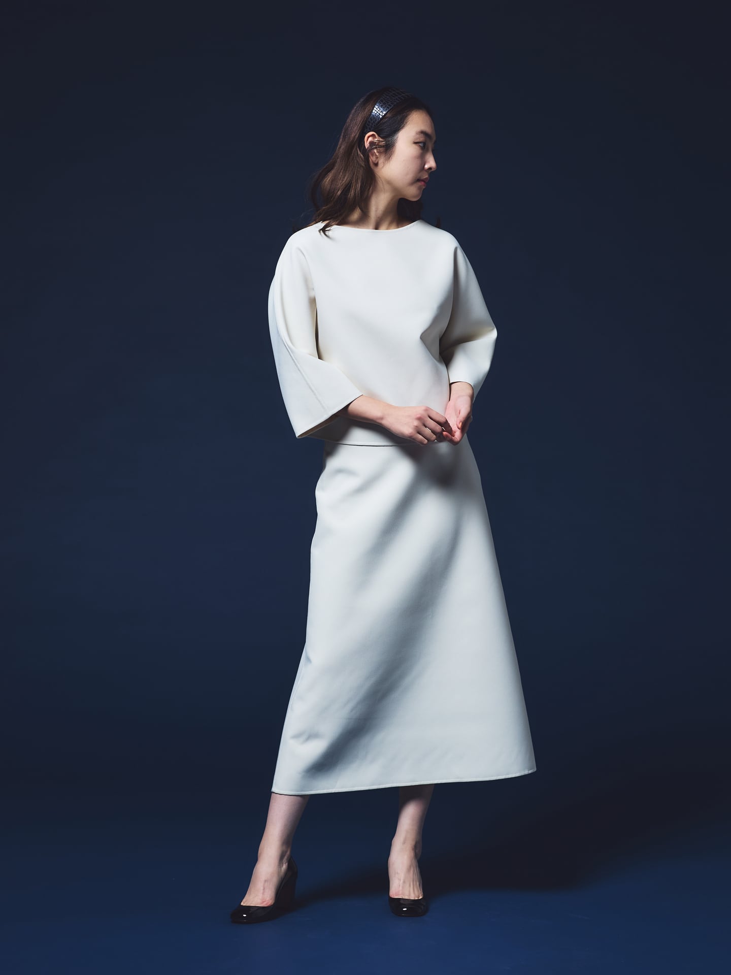 張りのある素材と立体感あるデザインで、体の線を拾わず、透け感もゼロ。アイボリーカラーで浮きすぎず、顔まわりも華やかにみせてくれます。SAQUIのテーパードリボンパンツやストレートスカートと合わせてビジネスシーンはもちろん、同素材のスカートとセットアップで、セレモニーや観劇などのお出かけシーンにも。コサージュやスカーフをプラスしても素敵です。控えめながらもオーセンティックな印象で、まさに大人のプルオーバーです。