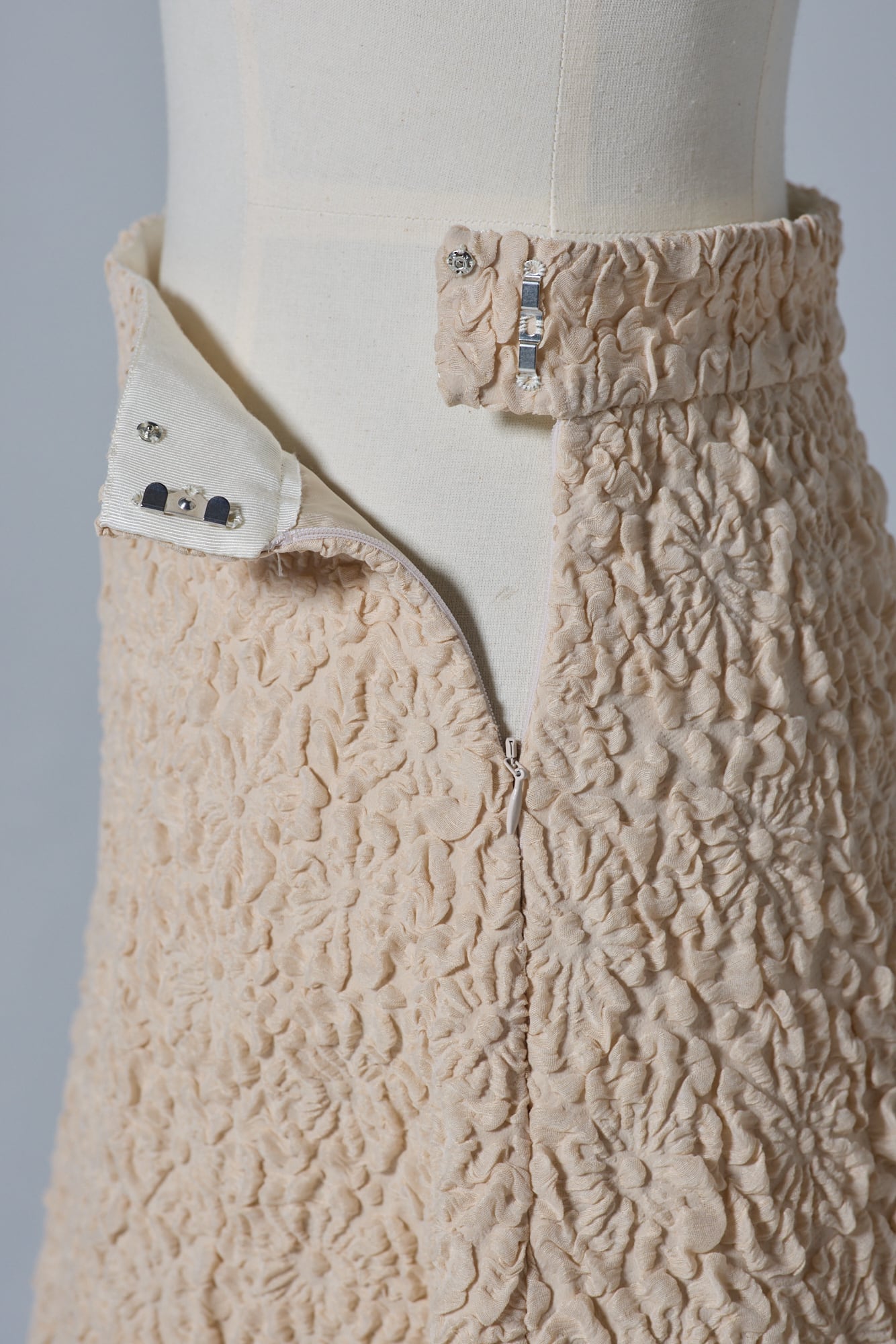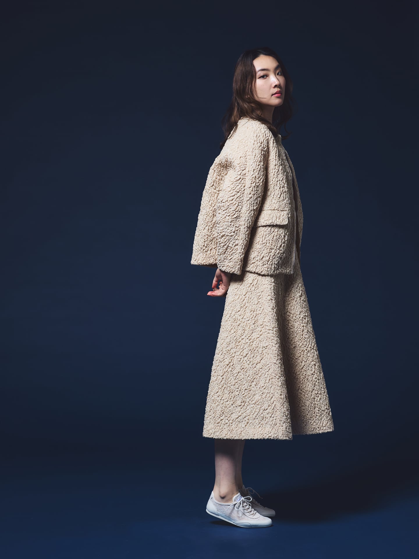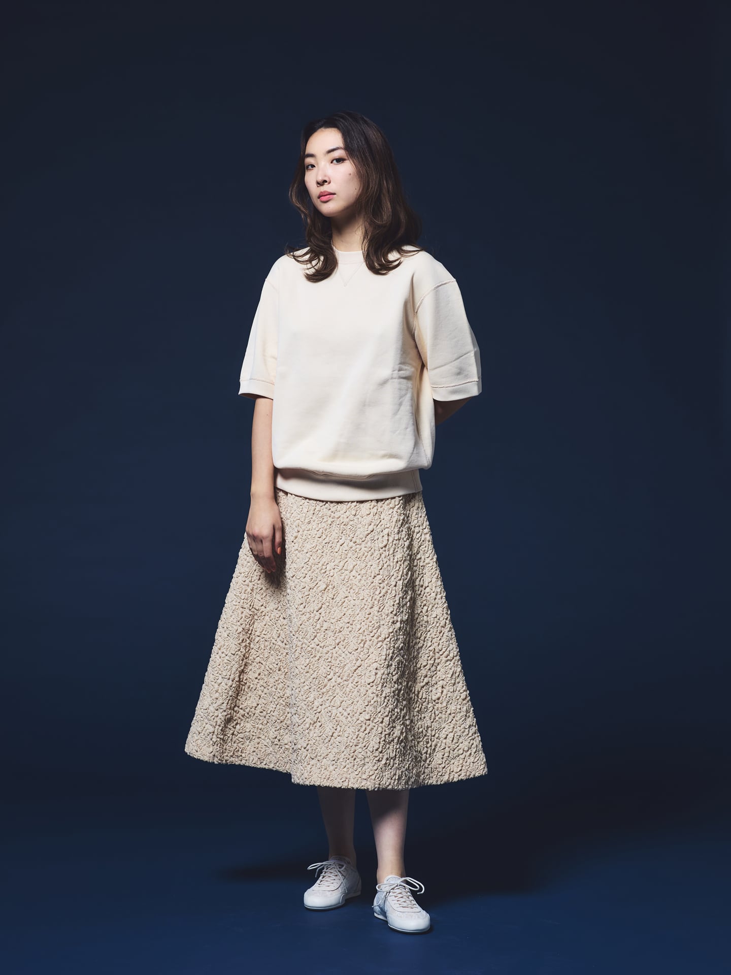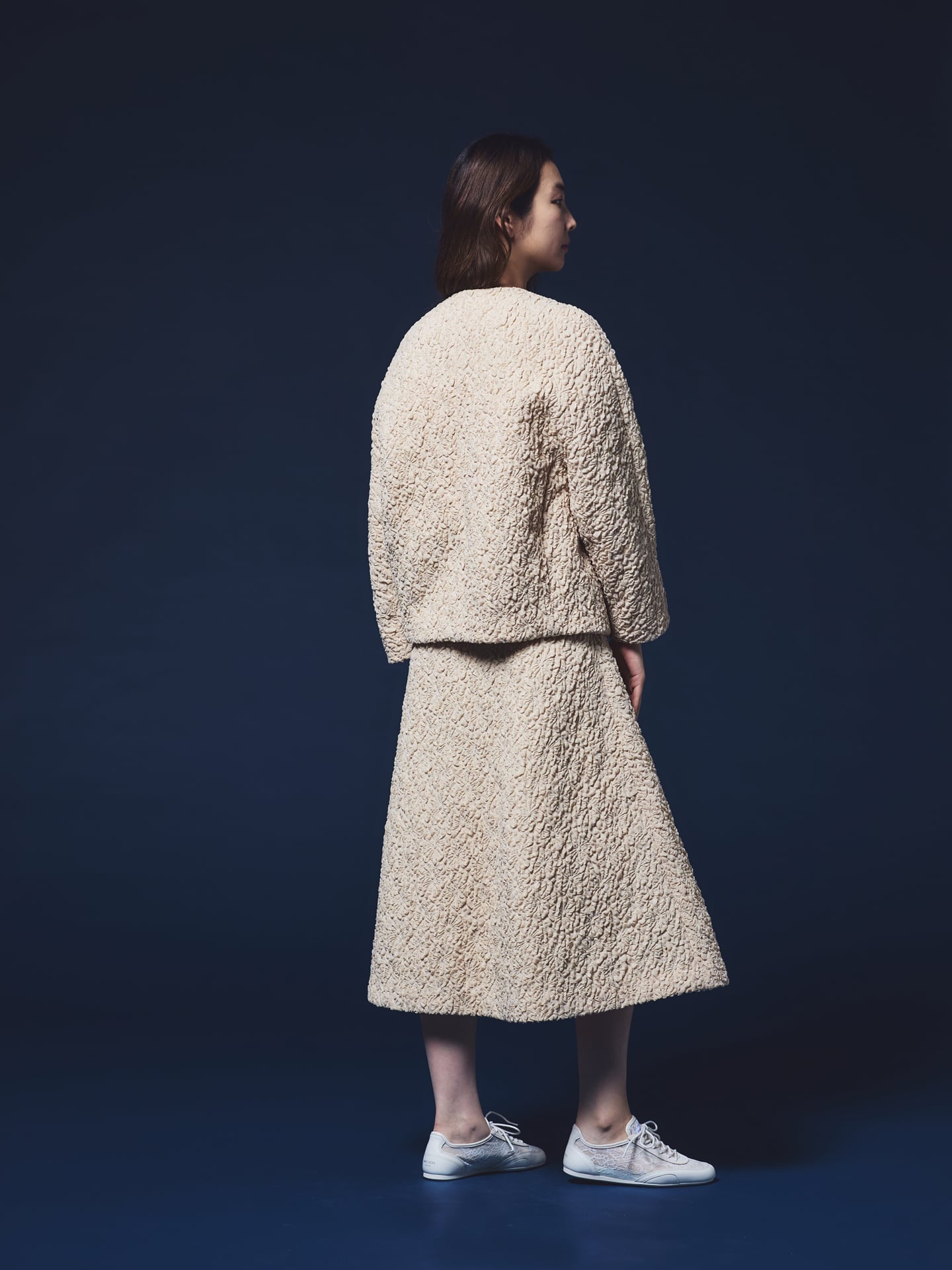 「生地の良さを最大限に活かすこと」が、「その服を纏った方を一番きれいに魅せてくれる」というのが、SAQUIのデザイナーが最も大切にしていることのひとつです。華やかな生地だからこそ、ギャザーやタックなどのない極力シンプルなデザインに。ふっくらした生地の魅力引きだすため、ボリュームのあるフレアにし、生地がしっかり見えるシルエットにしました。ウエストのベルトもスカートのボリュームがあるからこそポイントになると考え、あえて少し太めにすることで腰回りをコンパクトに見えるように、またクラシックな印象になるようデザインしました。